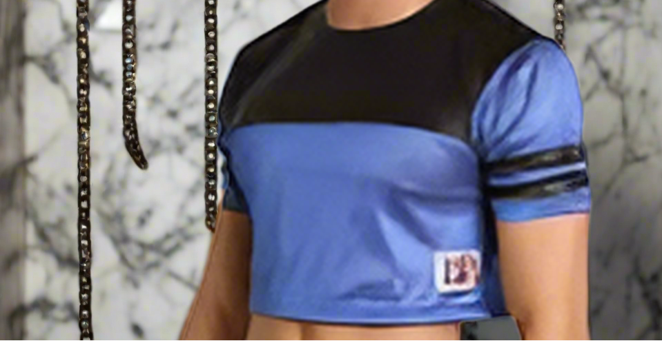 This football style, crop top jersey by Cellblock 13 is cut to really showcase your abs. Sporty mesh on the sleeves and at the bottom give a nice see-through quality so you can really show off your chest and arms as well. Slick and stretchy black Liquid Skin material makes up the upper body and arm details.