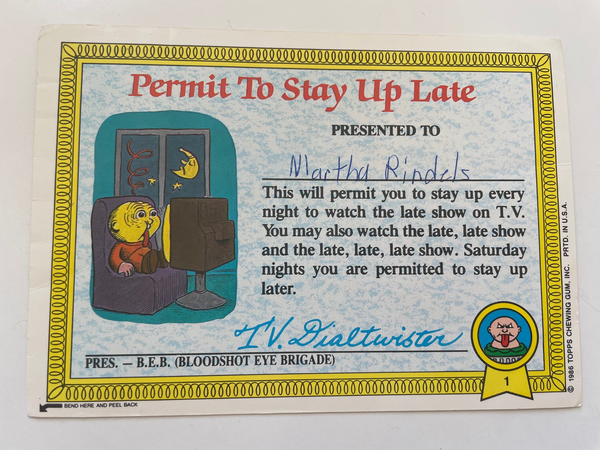 The back of each has a cheeky certificate on the back, and they are pristine other than some cool kid wrote their friends' names in Mad-Lib style, and never gave them out! OR they wrote fake names. Either way. Incredible.