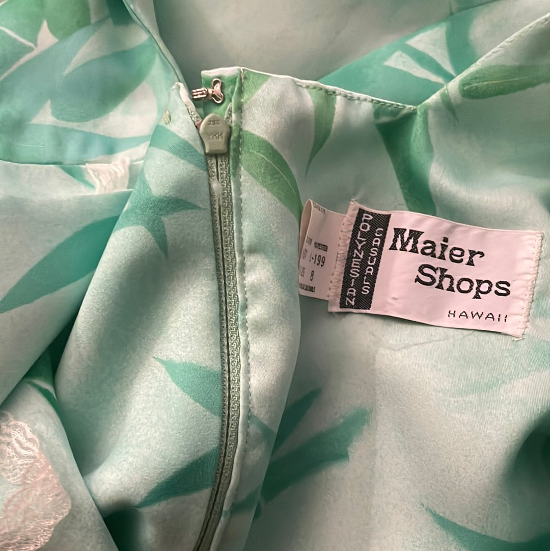Polynesian Casuals Maier Shops Hawaii aquate neckline bamboo motif 60’s maxi dress