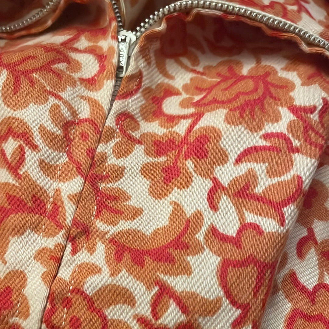 1950’s or Early 1960’s Heavy Cotton Metal Zipper Red and Orange Floral on Cream “new look” Collared Day Dress