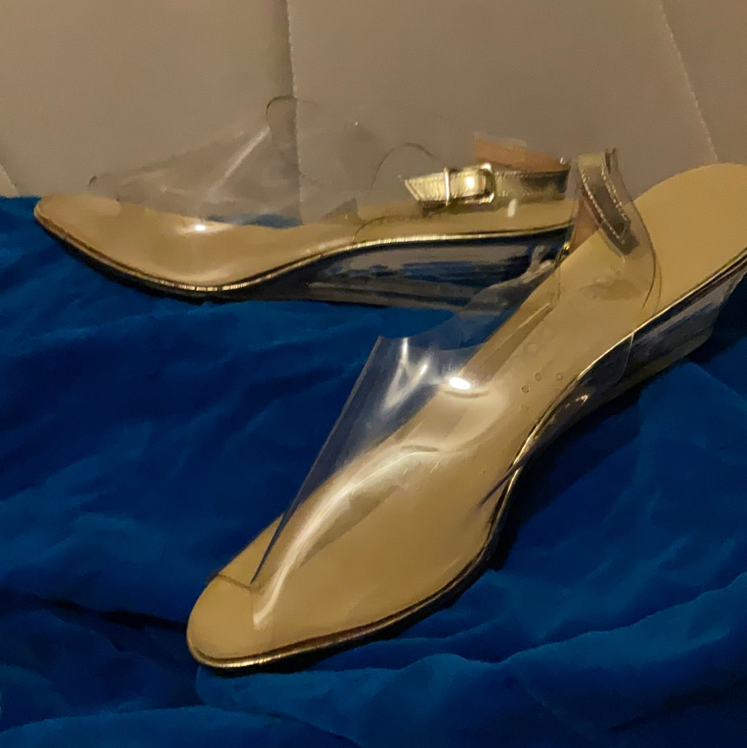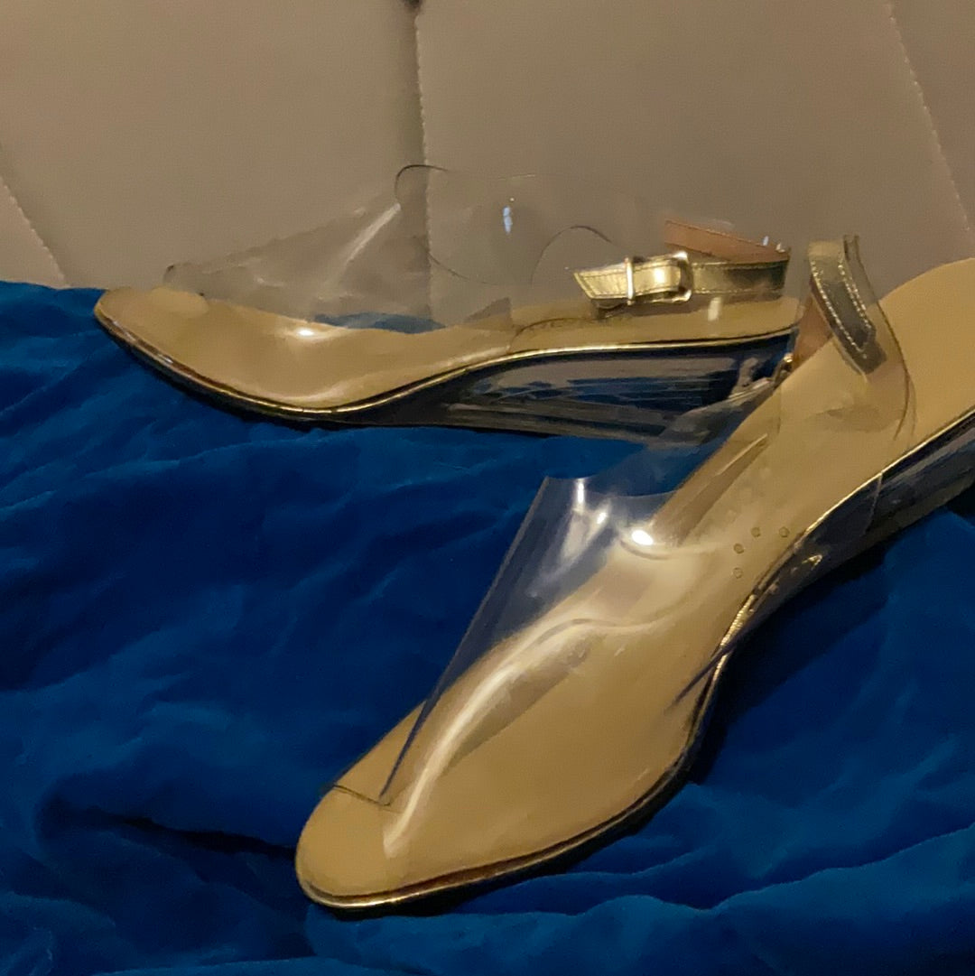 1970s Magdesian's Clear Vinyl Slingbacks | Vintage 70s Gold Peeptoe Kitten Wedges | Women's Shoes 7 M