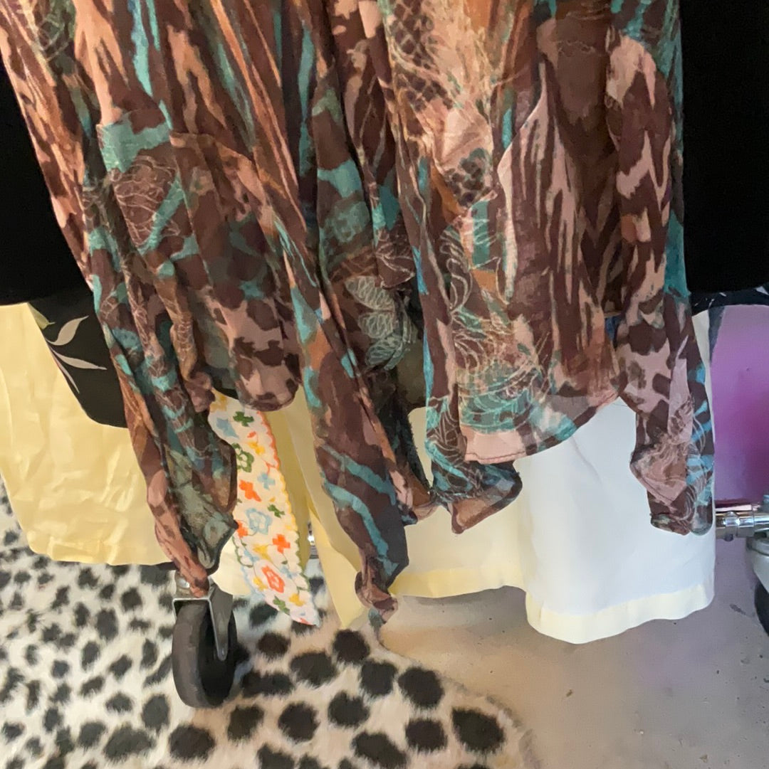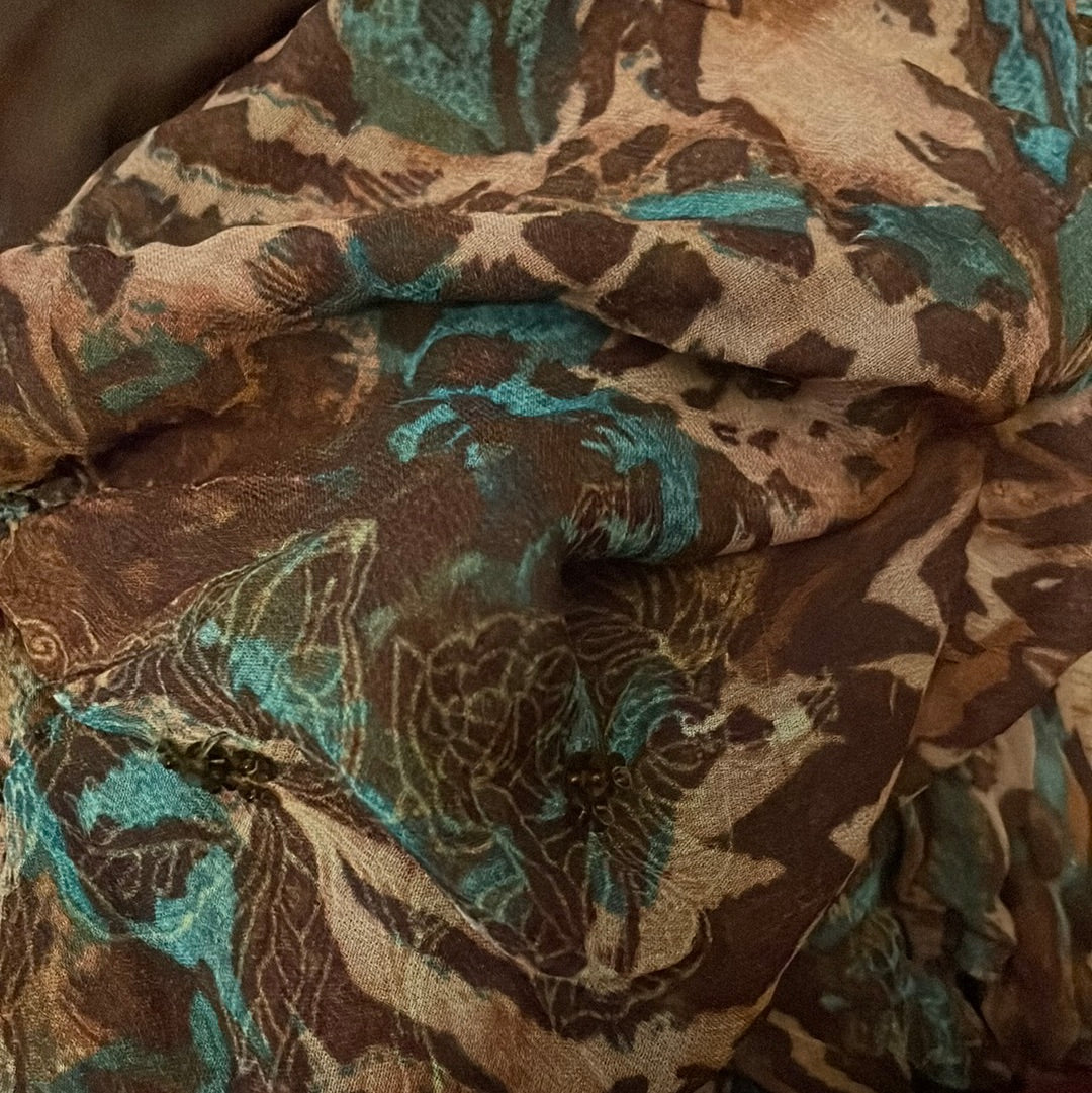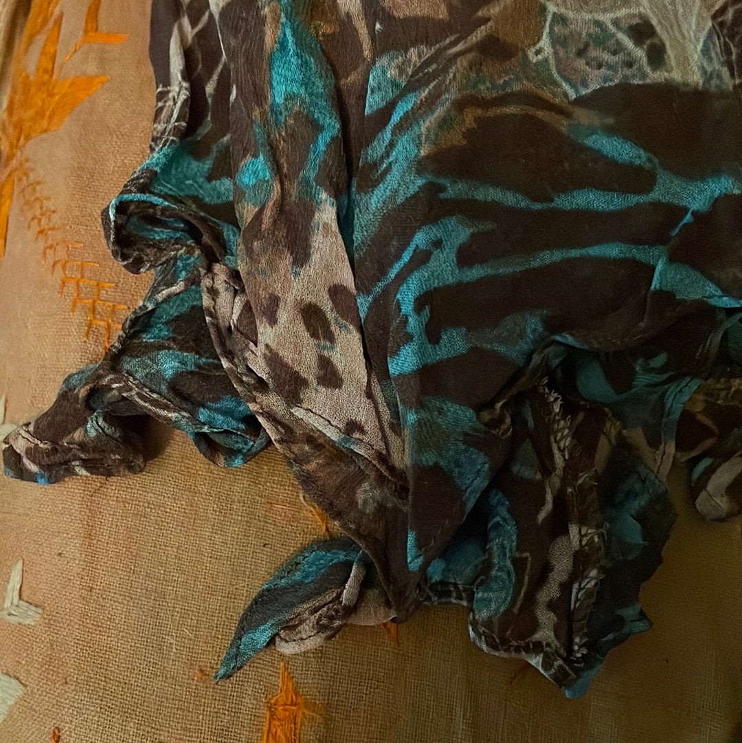 90’s Y2K Browns and Teals Animal and Floral Print Bias Cut Tattered Hem Seggsy Midi Dress