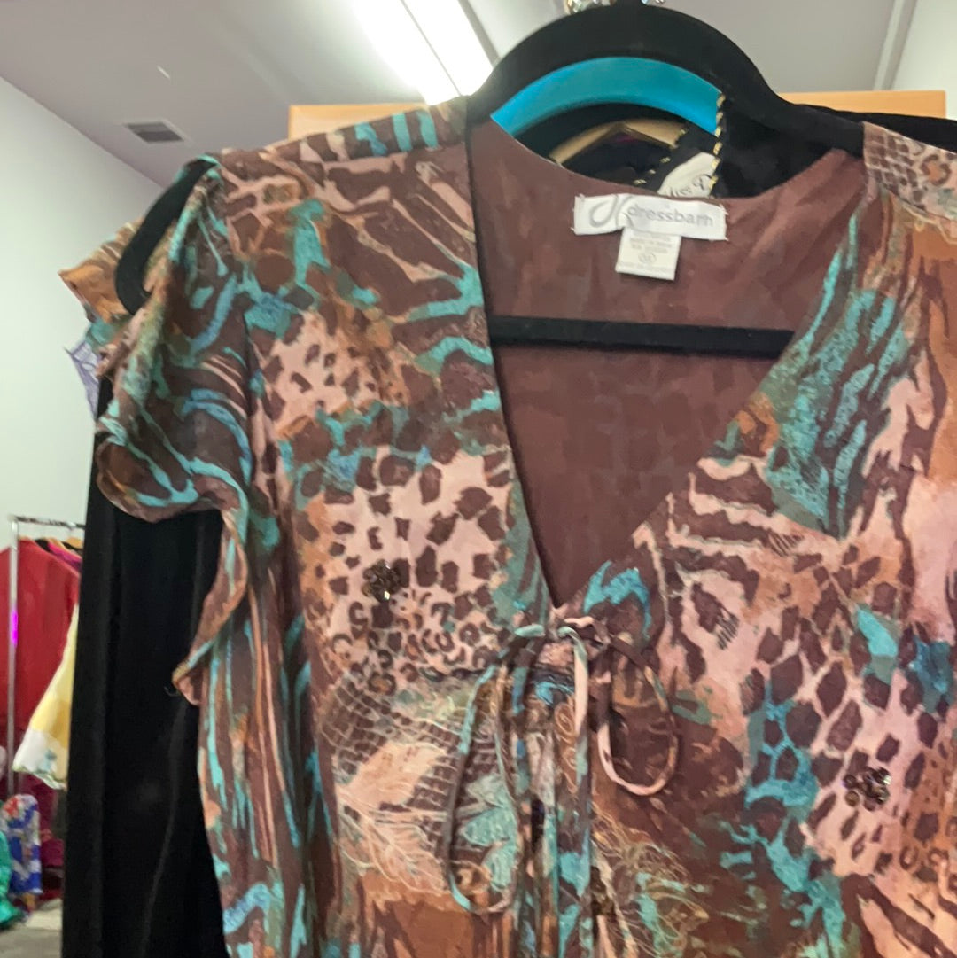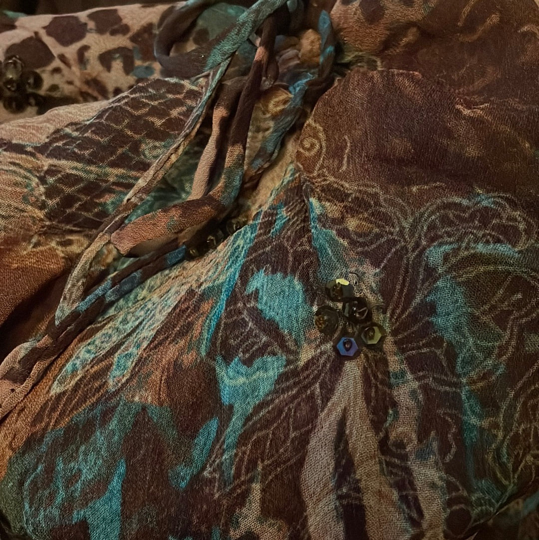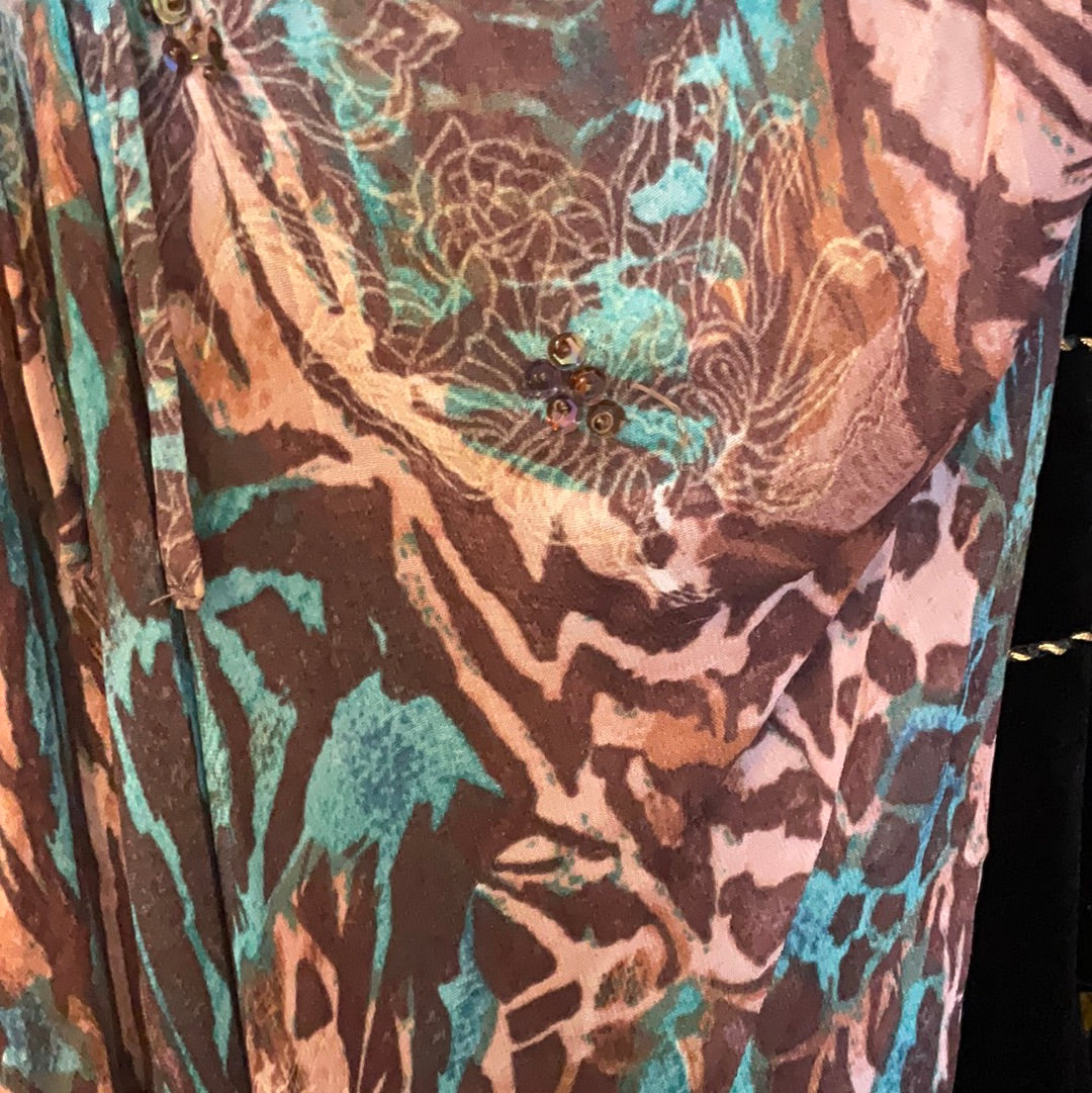 90’s Y2K Browns and Teals Animal and Floral Print Bias Cut Tattered Hem Seggsy Midi Dress