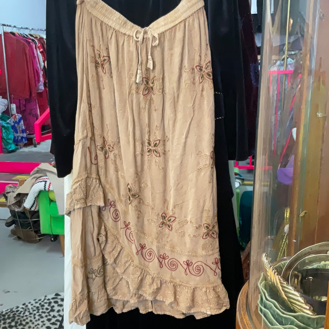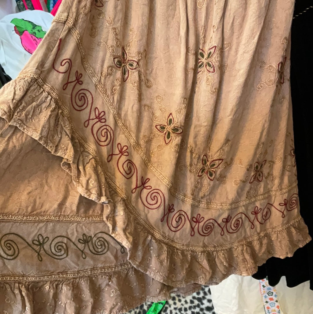 Again Traders Ruffle Asymmetrical Skirt Camel Color Embroidered