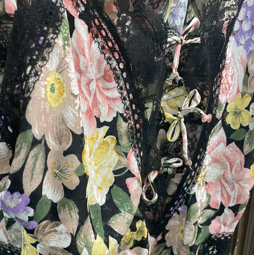 Gold Label Victoria Secret Floral with Black Lace Bow Front One Piece Negligee Size Large