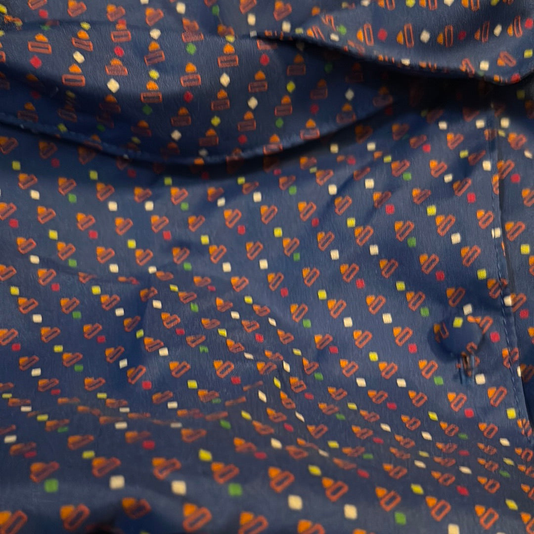 High neck asymmetrical button front midi dress abstract print on periwinkle