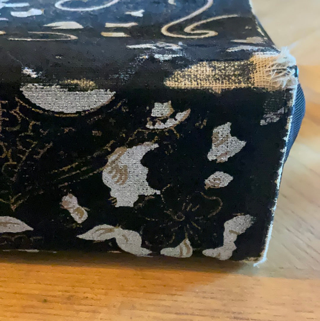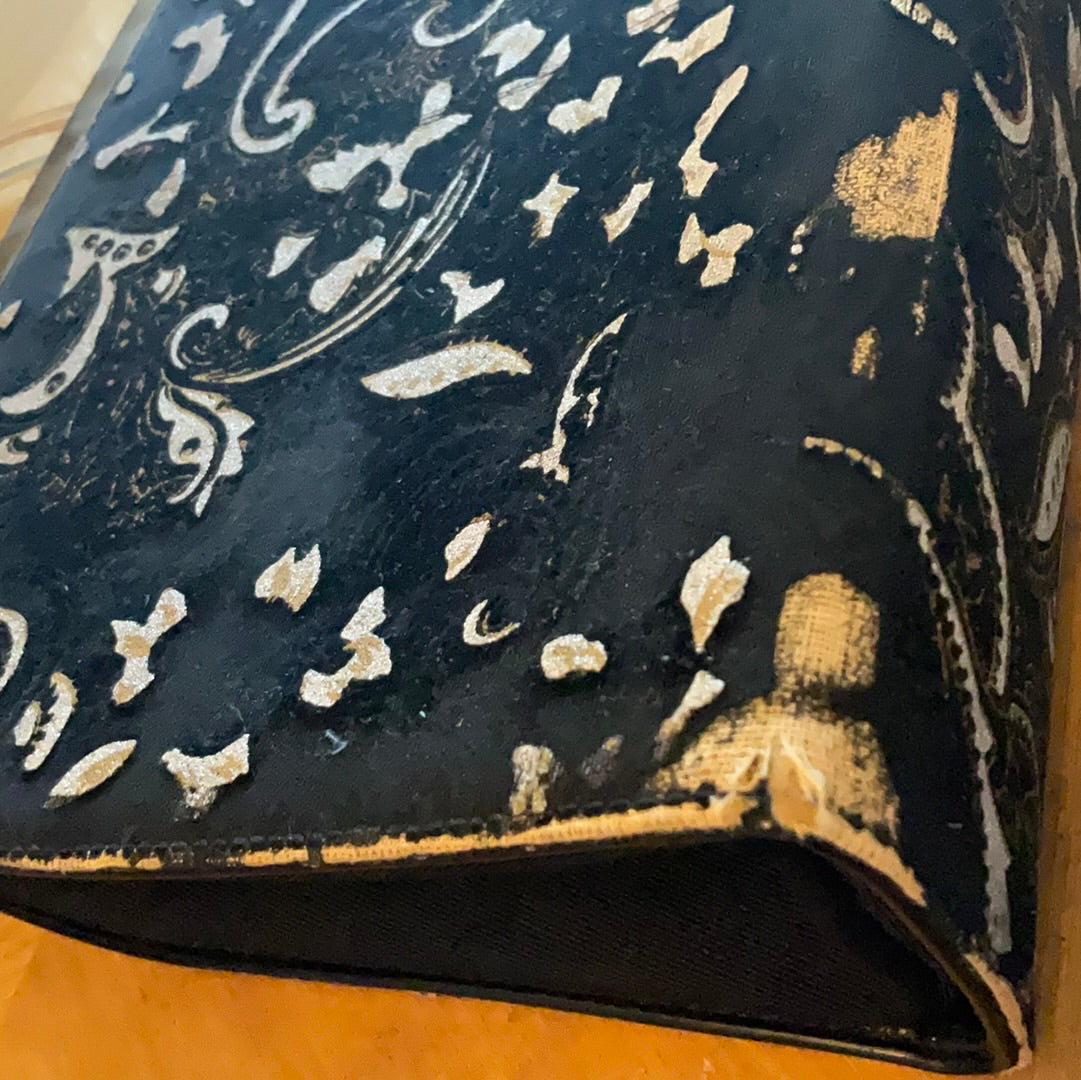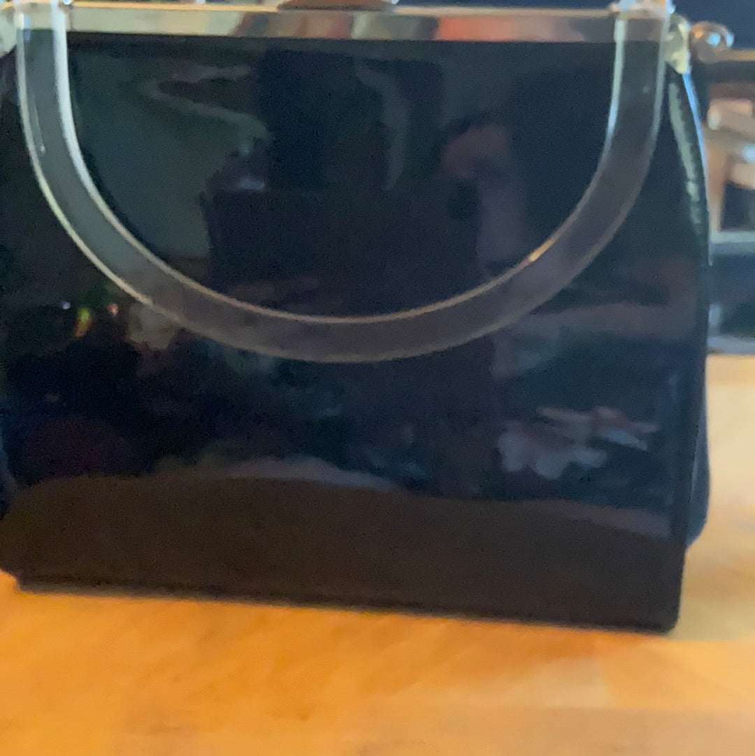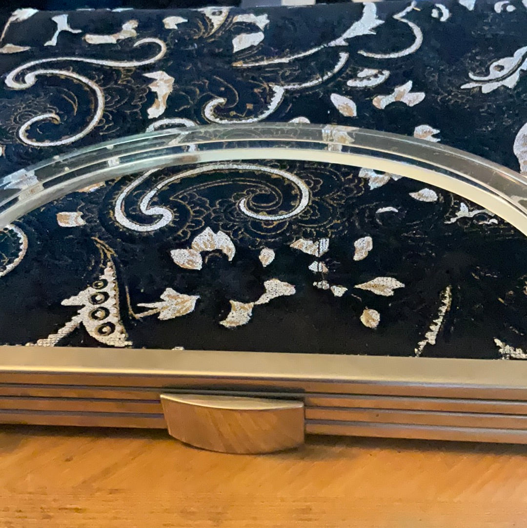 three in one top lock, vintage lucite handle handbag. It has a single clear plastic handle, silver top lock frame, the inside is lined in black satin fabric with a small side pocket, it has an outer reversible cover. One panel is black patent vinyl, one is flocked velvet silver and gold paisley motif, It is in very good condition, minor scuffs on the handle and minor wear to the velven side. Inside label is unreadable but I'm guessing it's a "Bags by Edwards". It measures about 9 inches wide at its base, 7.5 inches tall, 2 inches deep. This is an authentic one of a kind vintage piece in wearable condition, that has been cleaned and repaired (if necessary). Flaws will be noted, but please ask any questions you may have