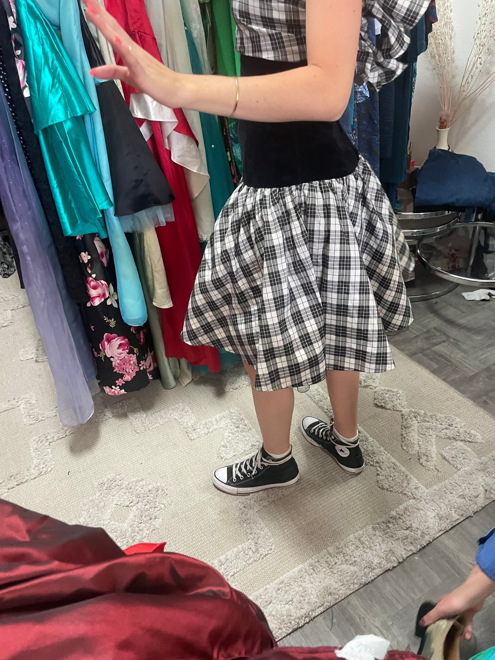 Taffeta and Velvet Bodice Black and White Plaid Strapless Mini Dress